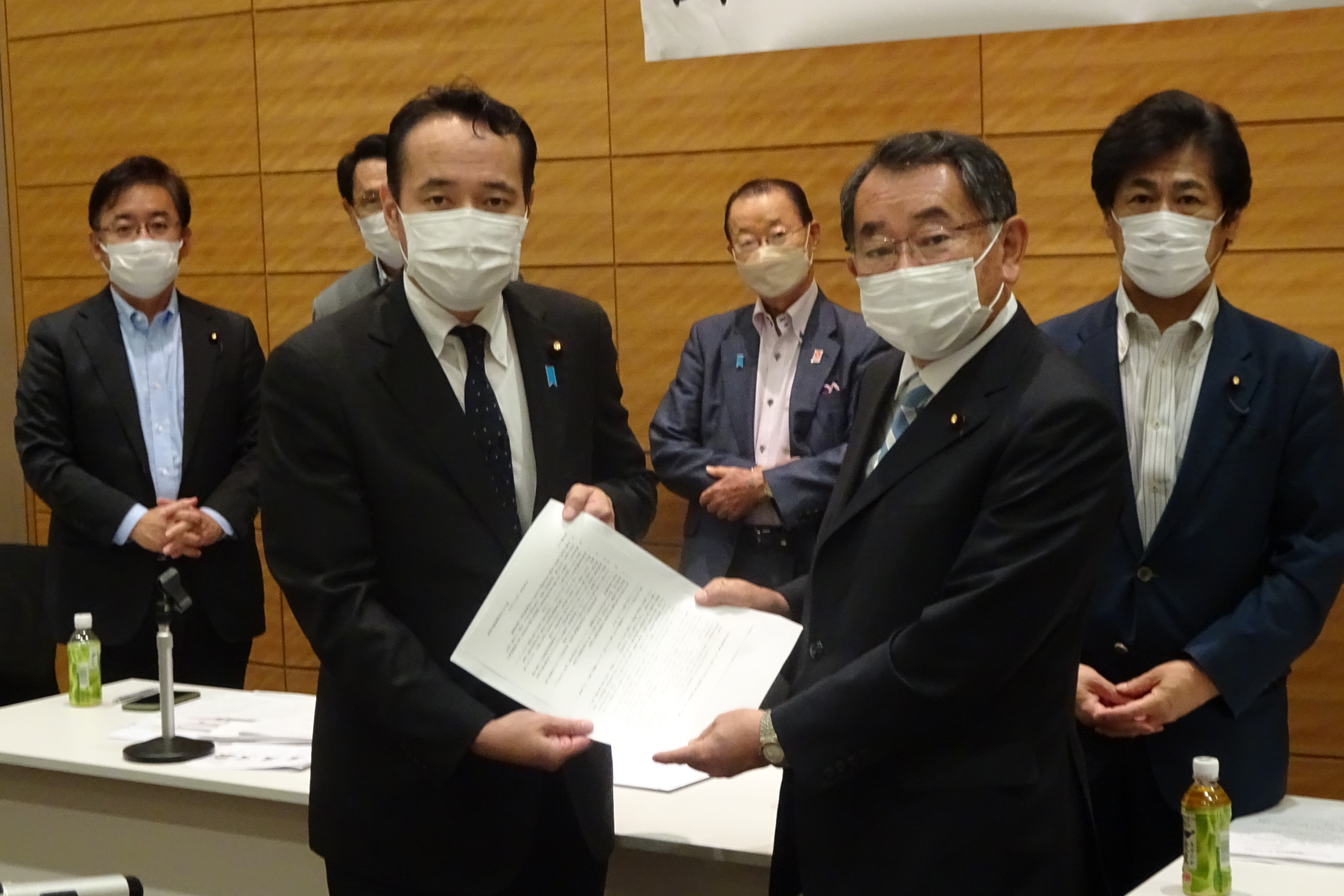![]() 塩谷会長から簗副大臣へ決議文手交の様子 |