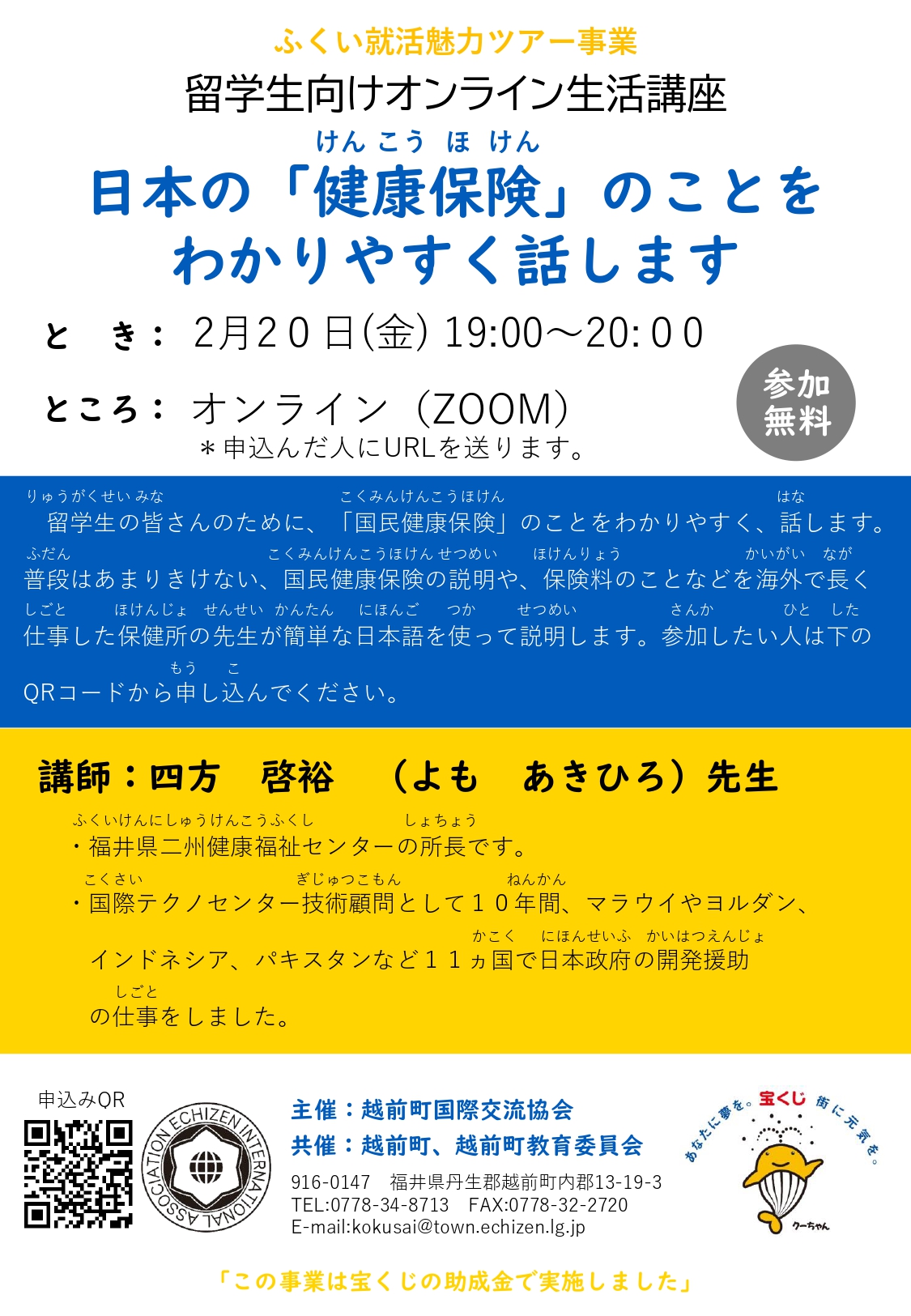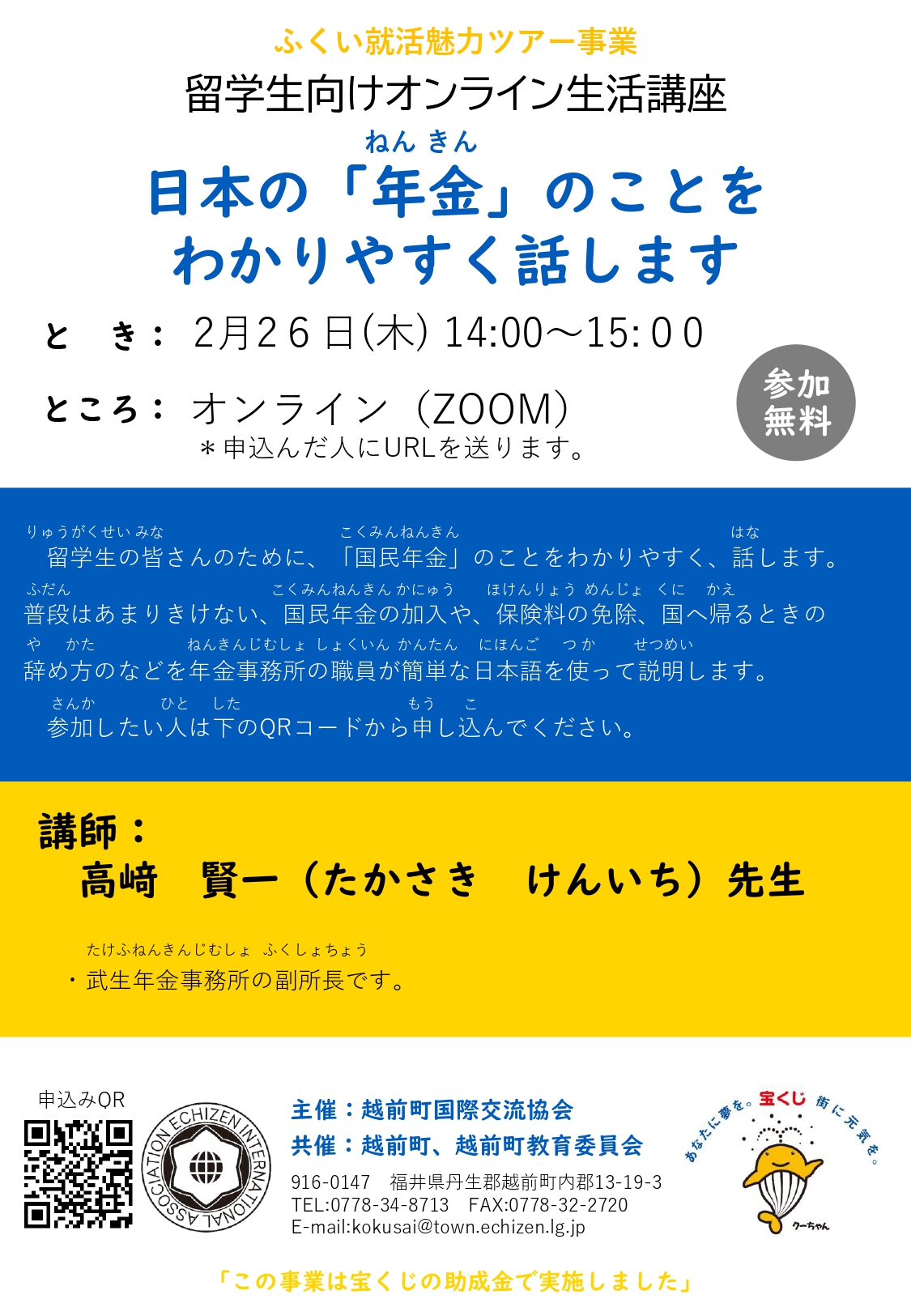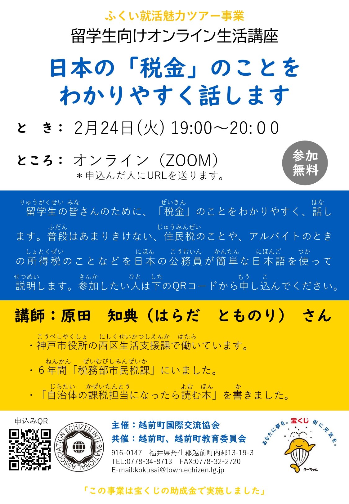 越前町では、下記の留学生向けオンライン生活講座を企画しています。詳細は以下をご覧ください。